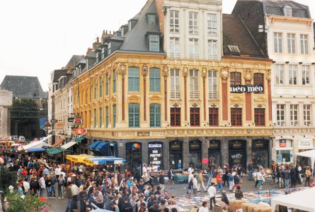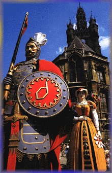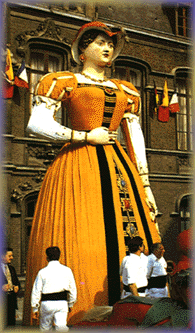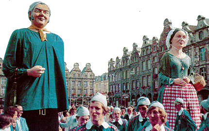 Here are two of the most famous (Gayant, 8.5 meters and 370 kg and his wife Marie-Cagenon), Giants of Douai (40 kms from Lille). They are more than 300 years old but only have three children. At the beginning of July, they go back home for one year. First Gayant stops at the top of their street, in front of the brasserie "chez Alex". Marie-Cagenon catches her children playing in the street and send them home. Last, she goes "chez Alex", and brings her husband back home.